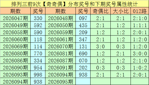上期回顾:排列三第2026094期开出奖号938,类型为:奇奇偶、002路和大小大。